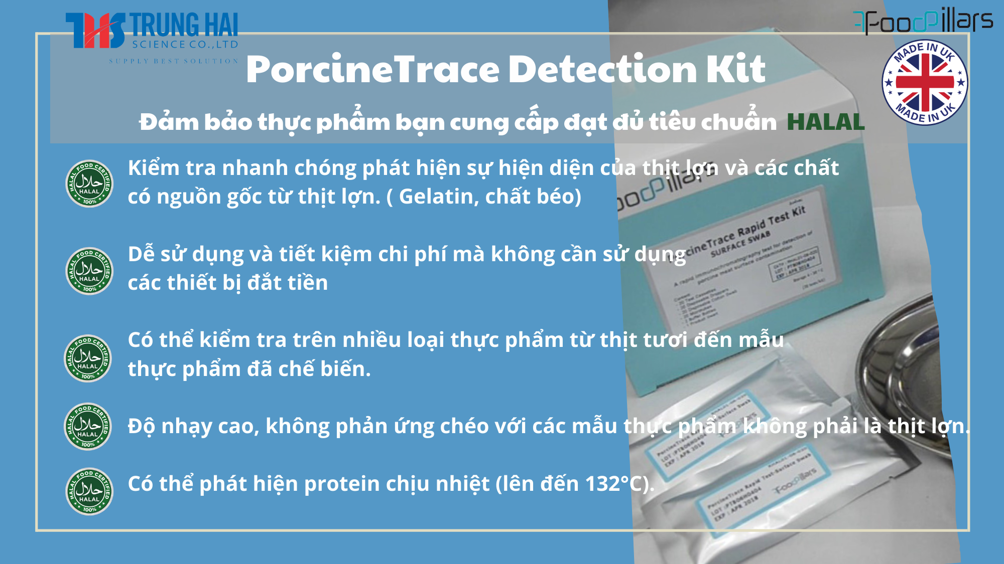 Dòng sản phẩm PorcineTrace Detection Kit của Trung Hải cung cấp các giải pháp kiểm tra vượt trội để đảm bảo rằng thực phẩm bạn cung cấp đạt đủ tiêu chuẩn Halal